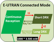 Important: Be careful not to confuse the LTE connected DRX cycle with the DRX the Idle mode. In Idle mode, the DRX is more related to paging, and so is often called DRX paging. This Idle mode DRX cycle time is much longer than the LTE, reaching seconds!