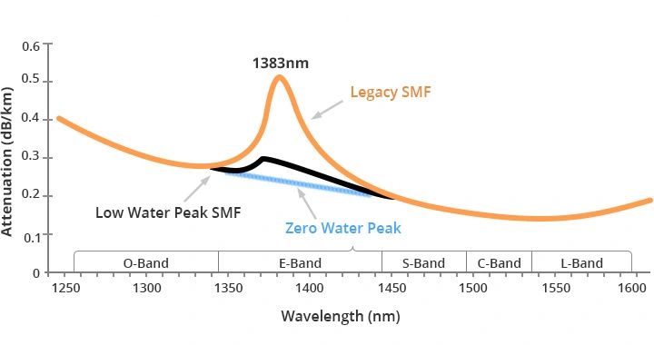 G.652.D fiber is the most current subcategory of G.652 fiber. What’s the difference between legacy G.652 fiber and G.652.D fiber? Compared with G.652.A fiber and G.652.B fiber, G.652.D fiber eliminates the water peak for full spectrum operation. Conventional G.652.A and G.652.B are not optimized for wavelength-division multiplexing (WDN) applications due to the high attenuation in the E-band region (1360-1460 nm), which is the water peak band. The G.652.D fiber has been developed to specifically reduce the water peak at the 1383nm wavelength range. So G.652.D fiber optic cable can be used in the wavelength regions 1310 nm and 1550 nm, and supporting Coarse WDM (CWDM) transmission.