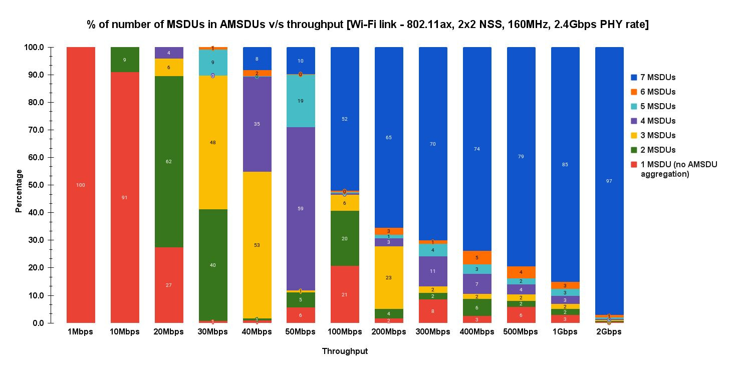 I tested which aggregation is commonly used at various throughput values in downlink direction with UDP traffic (Wi-Fi link is 802.11ax, 160MHz bandwidth, 2x2 NSS and 2.4Gbps PHY rate). Key highlights: