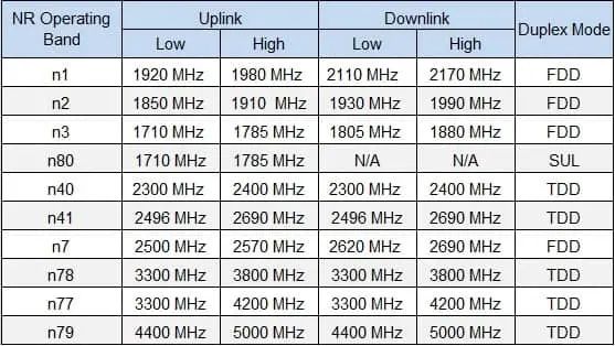 • Band n78 (3300–3800 MHz) supplies up to 100 MHz of contiguous bandwidth per carrier, subject to national licences.