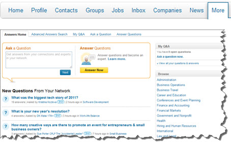 For example, if you don’t want to participate in any group, but would like to ask or answer questions, a good option is the section ‘Answers’, just below the ‘More’ Menu.