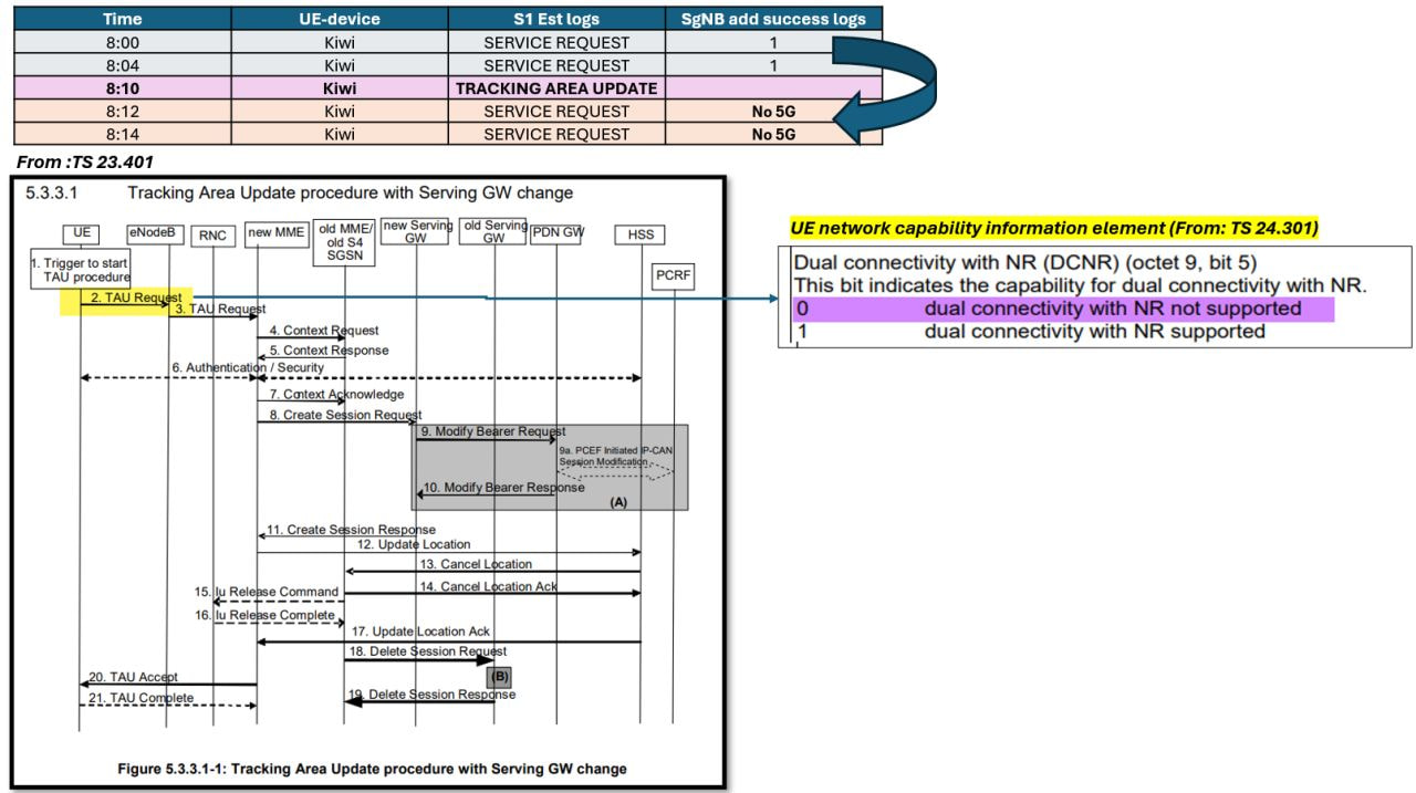 - However, after a Tracking Area Update (TAU) procedure, the device could no longer access 5G.